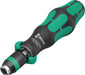 Bitholding screwdriver with a 36-tooth ratchet mechanism (10° return angle) for fast, reposition-free screwdriving. Ergonomic handle with intuitive switching between clockwise, counterclockwise, and neutral. Magnetic bitholder fits 1/4" hex bits (DIN ISO 1173-C 6.3 and E 6.3). Rapidaptor quick-release chuck for easy bit changes. Prevents blisters and calluses.
