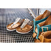 Genuine leather has been used as top material. Durable yet soft and the extra loop for the toe will keep the foot better in place. Due to its cork and latex footbed and anatomical insole, the foot will be supported when walking. The water-repellent and slip-resistant rubber sole will survive the occasional trip to the postbox.