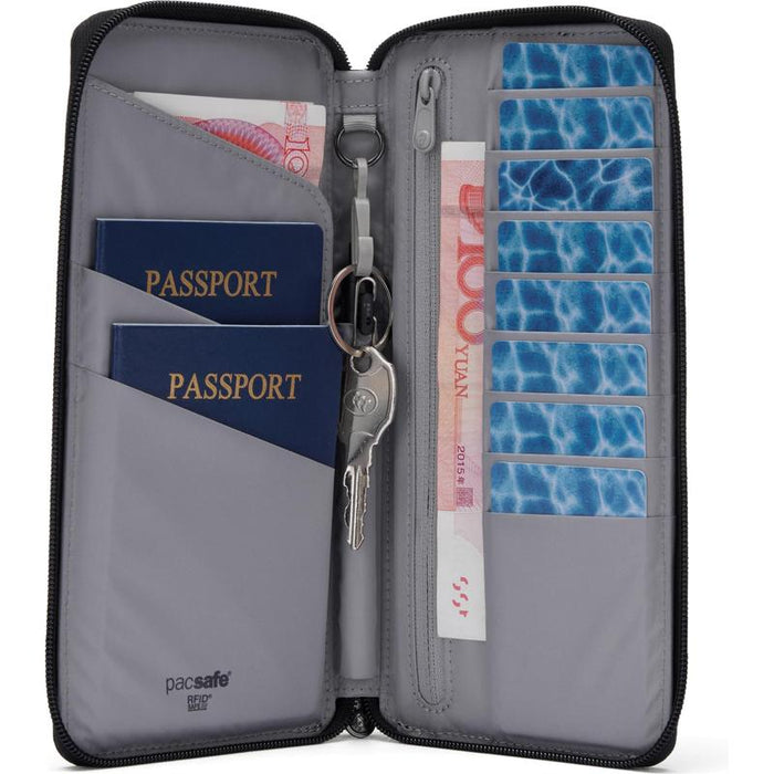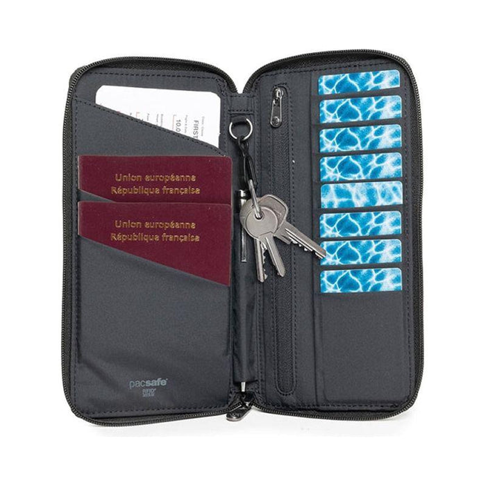 When you're on the move, keeping all your travel essentials in one secure place is a must. The Pacsafe RFIDsafe Travel Wallet is designed to hold your passports, boarding passes, credit cards, coins, and cash—all protected with anti-theft technology. A quick-access pocket on the back lets you instantly grab your boarding pass or passport without fumbling through your bag. It's perfect for solo or family travel, fitting up to two passports with ease.