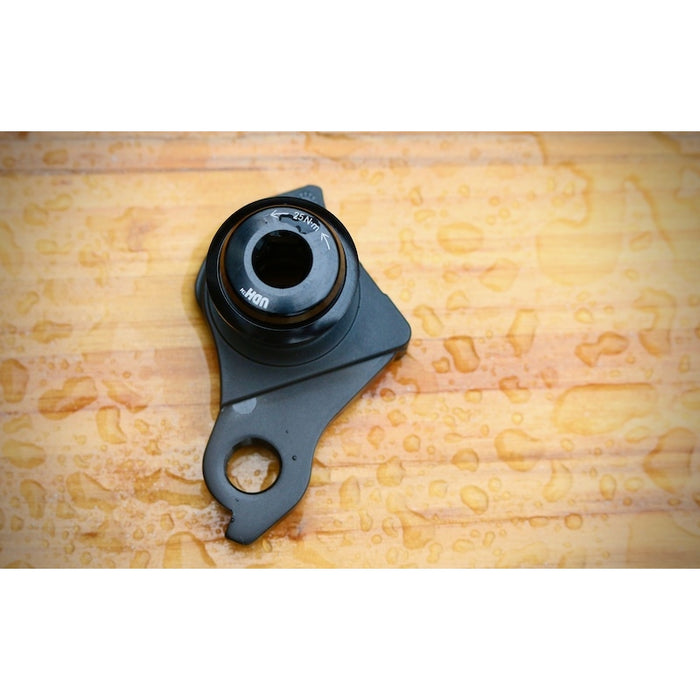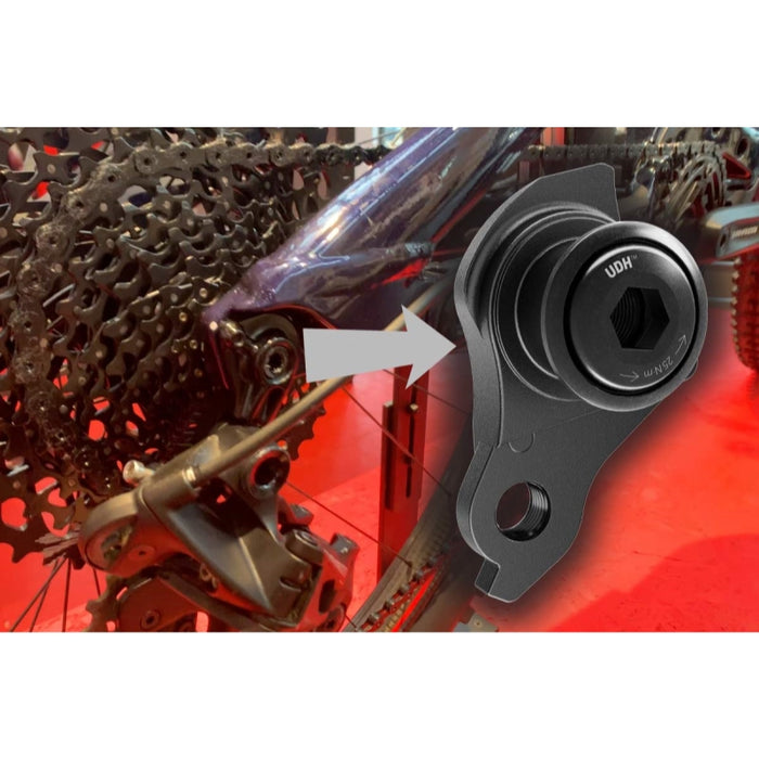 * The Universal Derailleur Hanger (UDH™) consolidates thousands of mountain bike derailleur standards.* Unparalleled derailleur protection. And perfect alignment. Guaranteed.* Designed to rotate rearward in the event of impact and features the ability to “re-rail” the chain back onto the small cog.* Works with all commercially available MTB and E-MTB drivetrains from Shimano to Box to Sunrace.* SRAM Model ID: AC-DRHG-MTB-A1